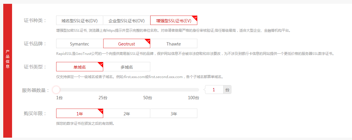 1、用户可在下单页选择GeoTrust品牌购买,点击下方的立即购买按钮;