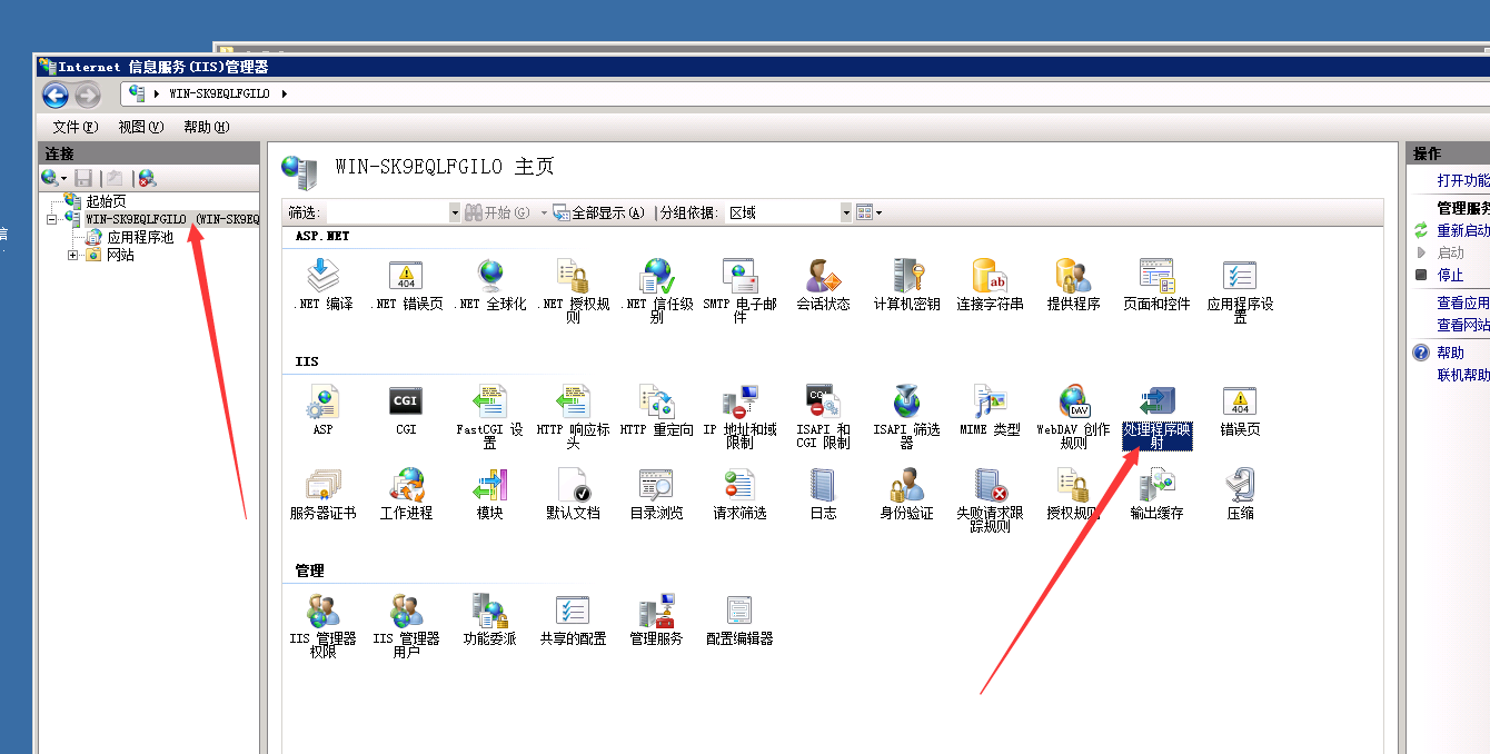 打开IIS7.5MMC管理界面,点击左边的机器名,右边将出现整个IIS的全局配置选项。